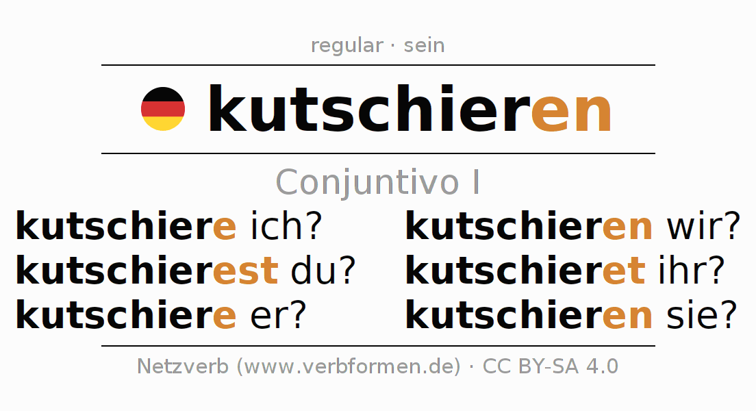 A conjugação do verbo kutschieren no Ativo Conjuntivo Presente Conjuntivo é: kutschiere ich?, kutschierest du?, kutschiere er?, kutschieren wir?, kutschieret ihr?, kutschieren sie?.A formação dessas formas segue determinadas regras gramaticais. Os requisitos para a conjugação do verbo como forma verbal simples no kutschieren do Conjuntivo I. Comentários ☆