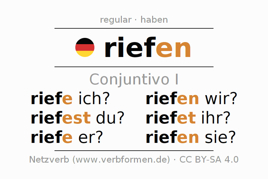 A conjugação do verbo riefen no Ativo Conjuntivo Presente Conjuntivo é: riefe ich?, riefest du?, riefe er?, riefen wir?, riefet ihr?, riefen sie?.A formação dessas formas segue determinadas regras gramaticais. Os requisitos para a conjugação do verbo como forma verbal simples no riefen do Conjuntivo I. Comentários ☆