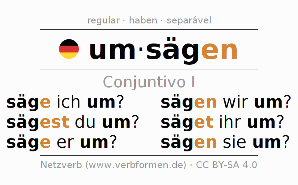 A conjugação do verbo umsägen no Ativo Conjuntivo Presente Conjuntivo é: säge ich um?, sägest du um?, säge er um?, sägen wir um?, säget ihr um?, sägen sie um?.A formação dessas formas segue determinadas regras gramaticais. Os requisitos para a conjugação do verbo como forma verbal simples no umsägen do Conjuntivo I. Comentários ☆