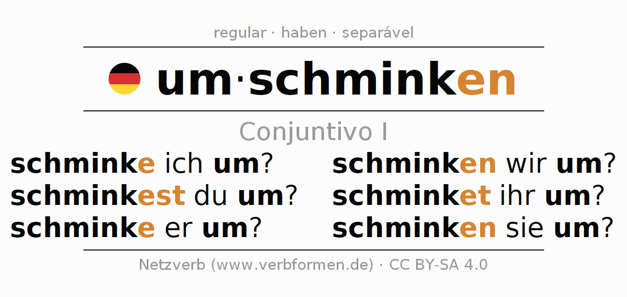 A conjugação do verbo umschminken no Ativo Conjuntivo Presente Conjuntivo é: schminke ich um?, schminkest du um?, schminke er um?, schminken wir um?, schminket ihr um?, schminken sie um?.A formação dessas formas segue determinadas regras gramaticais. Os requisitos para a conjugação do verbo como forma verbal simples no umschminken do Conjuntivo I. Comentários ☆