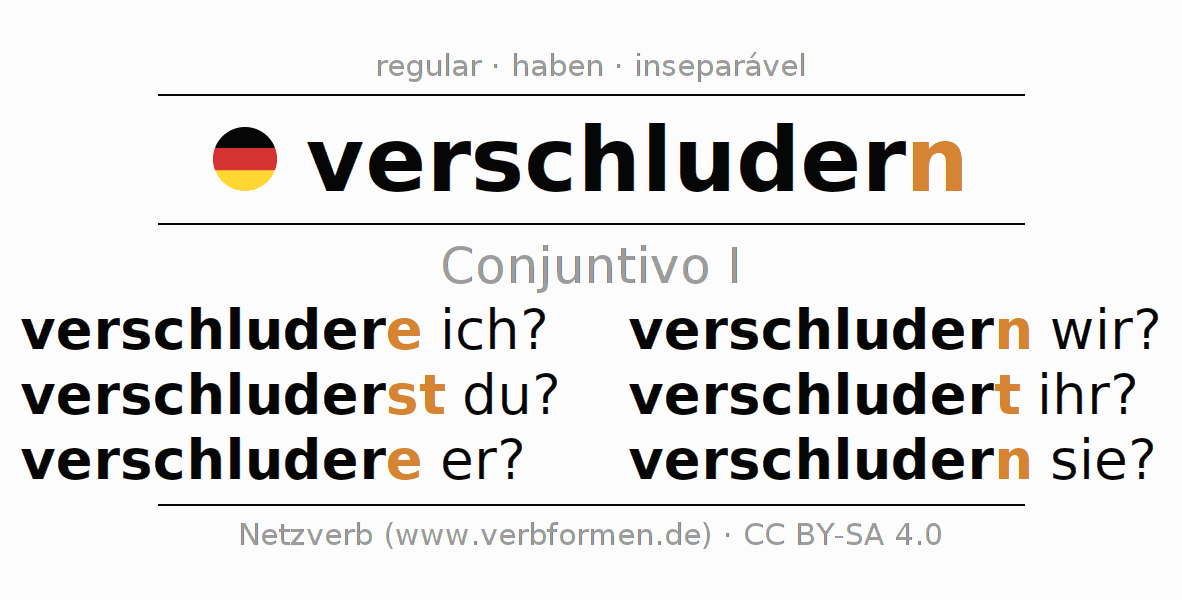A conjugação do verbo verschludern no Ativo Conjuntivo Presente Conjuntivo é: verschlud(e)re ich?, verschluderst du?, verschlud(e)re er?, verschludern wir?, verschludert ihr?, verschludern sie?.A formação dessas formas segue determinadas regras gramaticais. Os requisitos para a conjugação do verbo como forma verbal simples no verschludern do Conjuntivo I. Comentários ☆