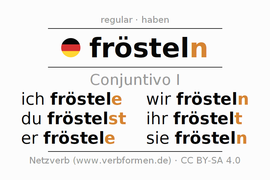 As formas de conjugação do verbo frösteln (frio, arrepio) no conjuntivo I são: ich fröst(e)le, du fröstelst, er fröst(e)le, wir frösteln, ihr fröstelt, sie frösteln