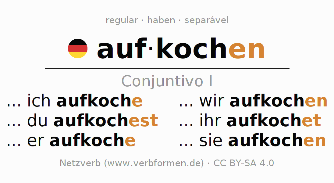 O verbo aufkochen (hat) é totalmente conjugado em todas as pessoas e números no Conjuntivo Presente