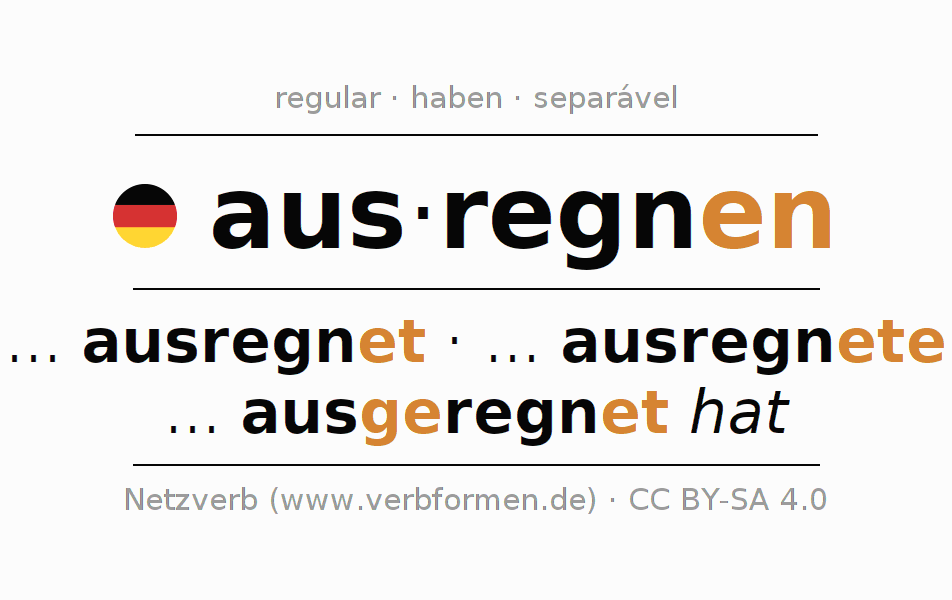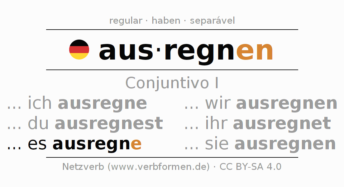 A conjugação do verbo ausregnen no Ativo Conjuntivo Presente Conjuntivo é: ... ich ausregne, ... du ausregnest, ... es ausregne, ... wir ausregnen, ... ihr ausregnet, ... sie ausregnen.A formação dessas formas segue determinadas regras gramaticais. Os requisitos para a conjugação do verbo como forma verbal simples no ausregnen do Conjuntivo I. Comentários ☆