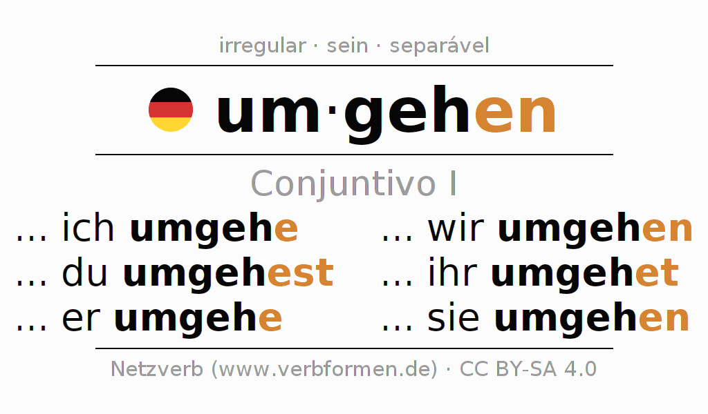 A conjugação do verbo umgehen no Ativo Conjuntivo Presente Conjuntivo é: ... ich umgehe, ... du umgehest, ... er umgehe, ... wir umgehen, ... ihr umgehet, ... sie umgehen.A formação dessas formas segue determinadas regras gramaticais. Os requisitos para a conjugação do verbo como forma verbal simples no umgehen do Conjuntivo I. Comentários ☆