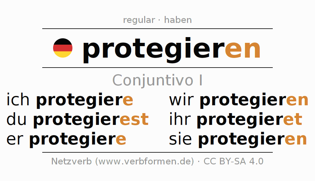 As formas de conjugação do verbo protegieren (apoiar, proteger) no conjuntivo I são: ich protegiere, du protegierest, er protegiere, wir protegieren, ihr protegieret, sie protegieren