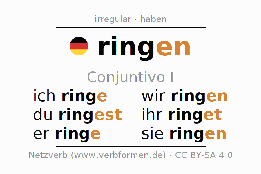 As formas de conjugação do verbo ringen (lutar, debater) no conjuntivo I são: ich ringe, du ringest, er ringe, wir ringen, ihr ringet, sie ringen