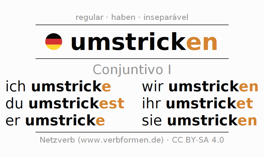 As formas de conjugação do verbo umstricken (cobrir, cortejar) no conjuntivo I são: ich umstricke, du umstrickest, er umstricke, wir umstricken, ihr umstricket, sie umstricken