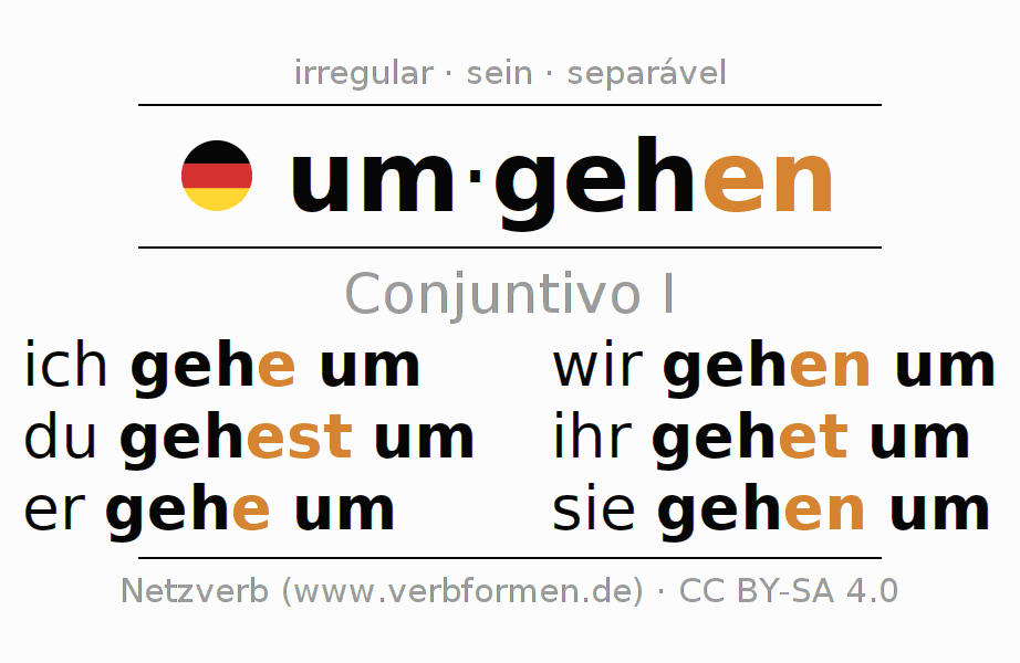As formas de conjugação do verbo umgehen (circular, lidar) no conjuntivo I são: ich gehe um, du gehest um, er gehe um, wir gehen um, ihr gehet um, sie gehen um
