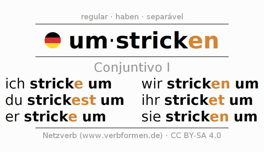 As formas de conjugação do verbo umstricken (desmanchar, reconstruir) no conjuntivo I são: ich stricke um, du strickest um, er stricke um, wir stricken um, ihr stricket um, sie stricken um