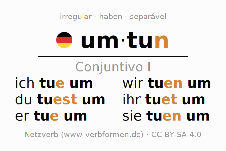 As formas de conjugação do verbo umtun (buscar, cobrir) no conjuntivo I são: ich tue um, du tuest um, er tue um, wir tuen um, ihr tuet um, sie tuen um