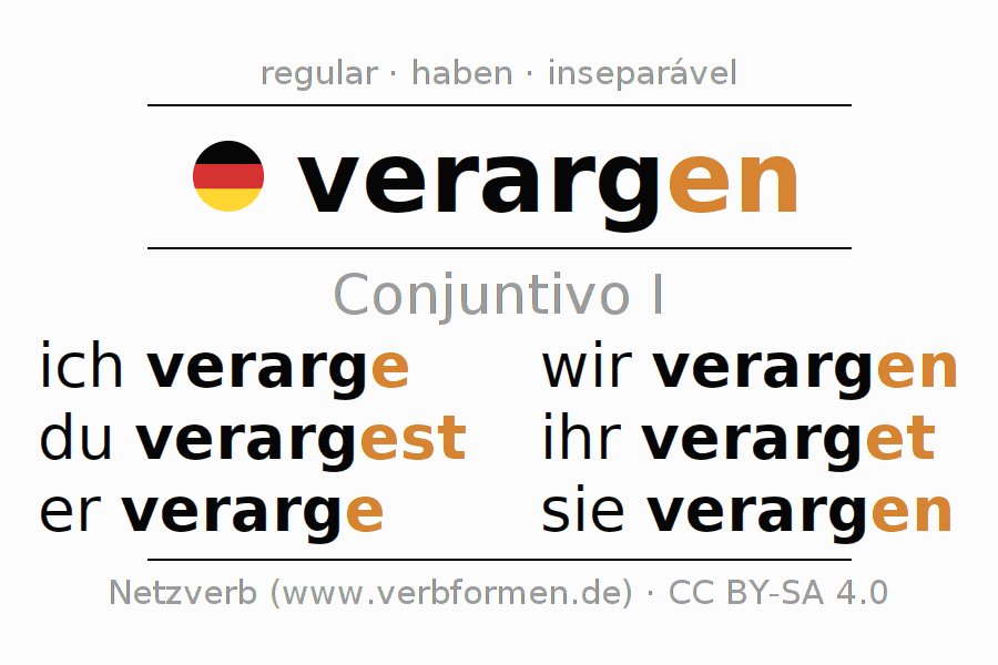 As formas de conjugação do verbo verargen (ressentir, guardar rancor) no conjuntivo I são: ich verarge, du verargest, er verarge, wir verargen, ihr verarget, sie verargen