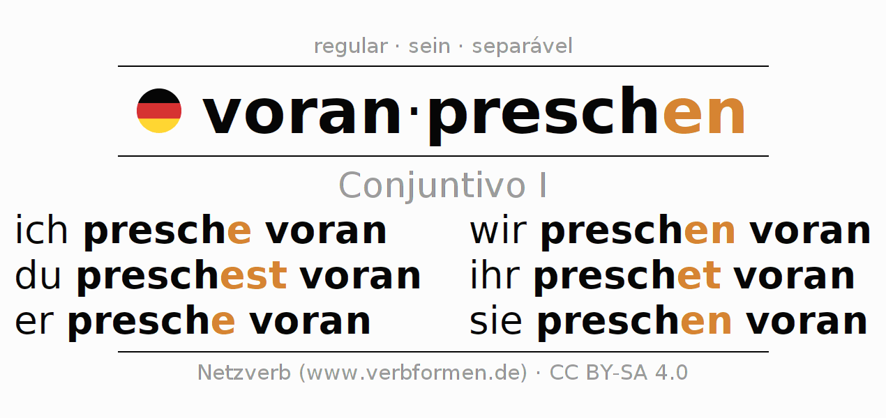 As formas de conjugação do verbo voranpreschen (avançar, progredir) no conjuntivo I são: ich presche voran, du preschest voran, er presche voran, wir preschen voran, ihr preschet voran, sie preschen voran