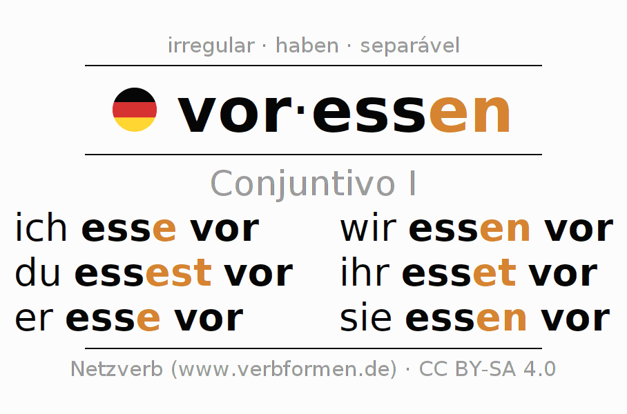 As formas de conjugação do verbo voressen (comer, devorar) no conjuntivo I são: ich esse vor, du essest vor, er esse vor, wir essen vor, ihr esset vor, sie essen vor