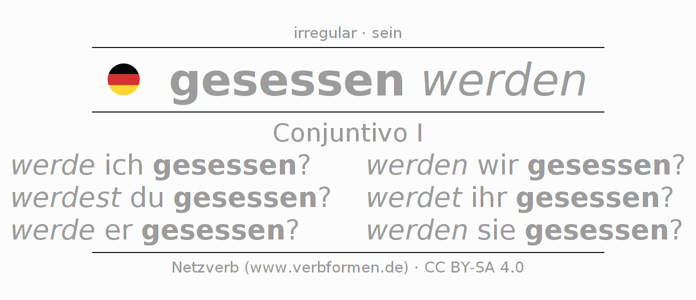 A conjugação do verbo sitzen no Voz Passiva Conjuntivo Presente Conjuntivo é: werde ich gesessen?, werdest du gesessen?, werde er gesessen?, werden wir gesessen?, werdet ihr gesessen?, werden sie gesessen?.A formação dessas formas segue determinadas regras gramaticais. Os requisitos para a conjugação do verbo como forma verbal simples no sitzen do Conjuntivo I. Comentários ☆