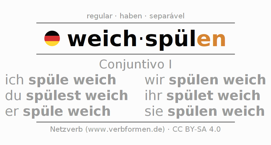 As formas de conjugação do verbo weichspülen (suavizar, amaciar) no conjuntivo I são: ich spüle weich, du spülest weich, er spüle weich, wir spülen weich, ihr spület weich, sie spülen weich