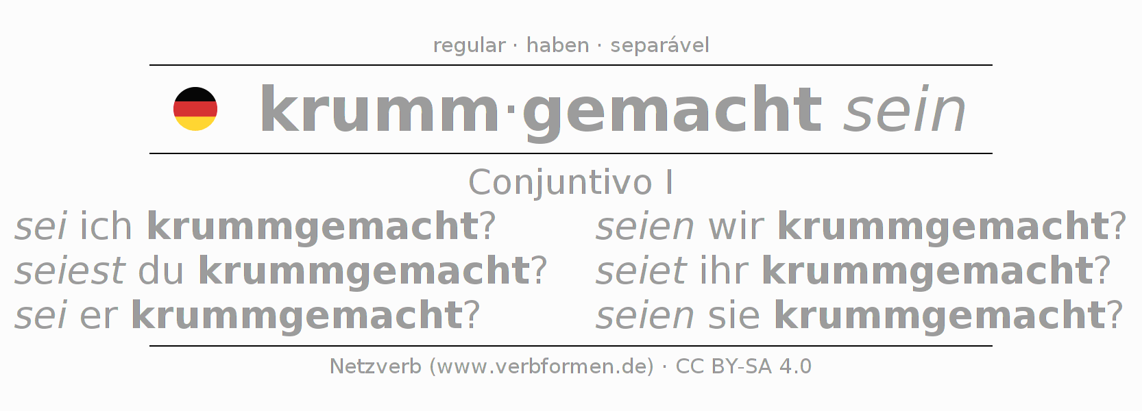 A conjugação do verbo krummmachen no Estado passivo Conjuntivo Presente Conjuntivo é: sei ich krummgemacht?, seiest du krummgemacht?, sei er krummgemacht?, seien wir krummgemacht?, seiet ihr krummgemacht?, seien sie krummgemacht?.A formação dessas formas segue determinadas regras gramaticais. Os requisitos para a conjugação do verbo como forma verbal simples no krummmachen do Conjuntivo I. Comentários ☆