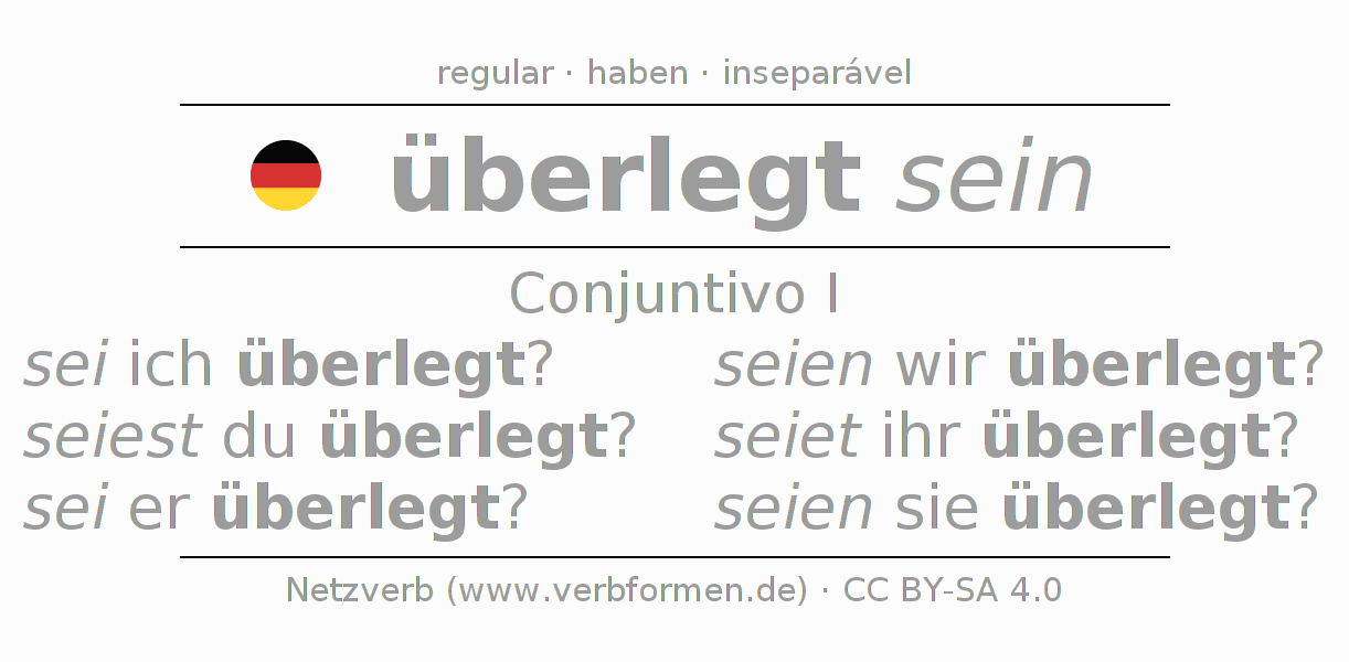 A conjugação do verbo überlegen no Estado passivo Conjuntivo Presente Conjuntivo é: sei ich überlegt?, seiest du überlegt?, sei er überlegt?, seien wir überlegt?, seiet ihr überlegt?, seien sie überlegt?.A formação dessas formas segue determinadas regras gramaticais. Os requisitos para a conjugação do verbo como forma verbal simples no überlegen do Conjuntivo I. Comentários ☆
