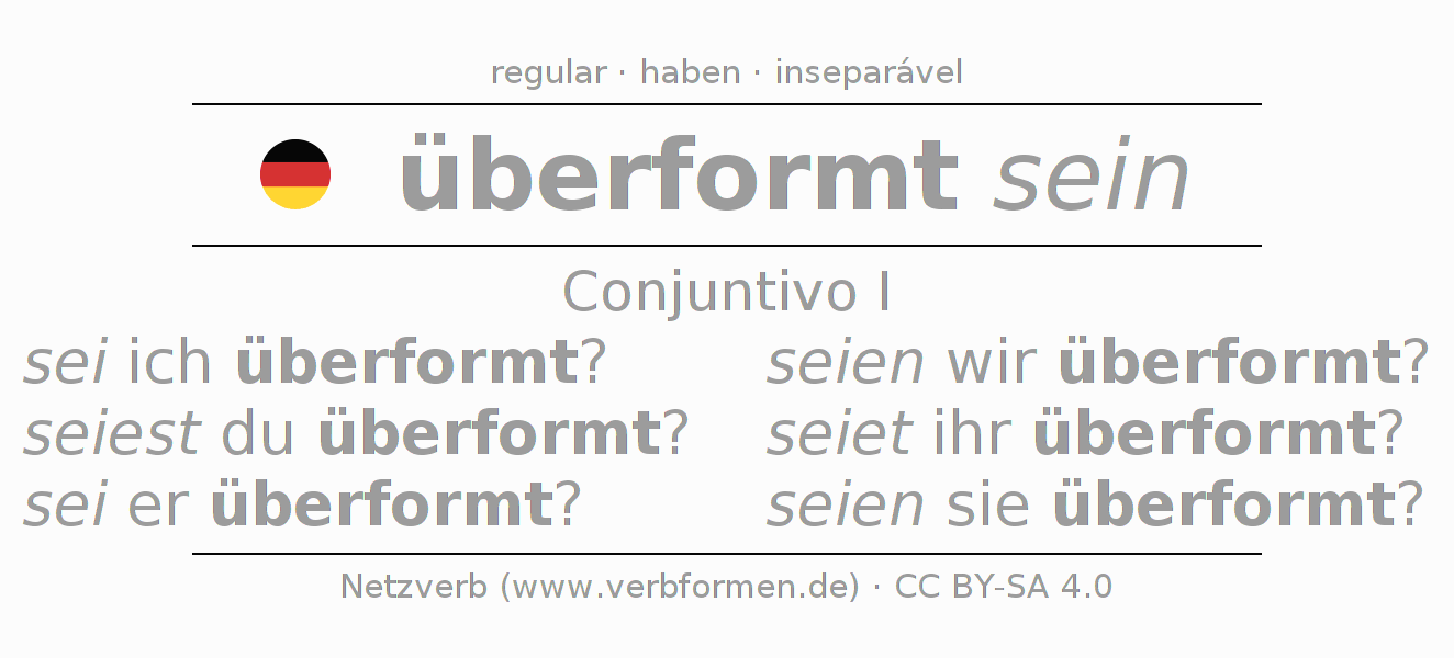 A conjugação do verbo überformen no Estado passivo Conjuntivo Presente Conjuntivo é: sei ich überformt?, seiest du überformt?, sei er überformt?, seien wir überformt?, seiet ihr überformt?, seien sie überformt?.A formação dessas formas segue determinadas regras gramaticais. Os requisitos para a conjugação do verbo como forma verbal simples no überformen do Conjuntivo I. Comentários ☆