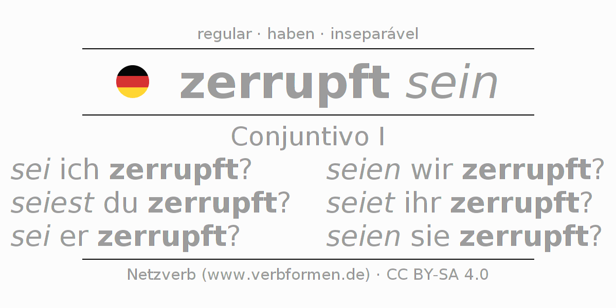 A conjugação do verbo zerrupfen no Estado passivo Conjuntivo Presente Conjuntivo é: sei ich zerrupft?, seiest du zerrupft?, sei er zerrupft?, seien wir zerrupft?, seiet ihr zerrupft?, seien sie zerrupft?.A formação dessas formas segue determinadas regras gramaticais. Os requisitos para a conjugação do verbo como forma verbal simples no zerrupfen do Conjuntivo I. Comentários ☆