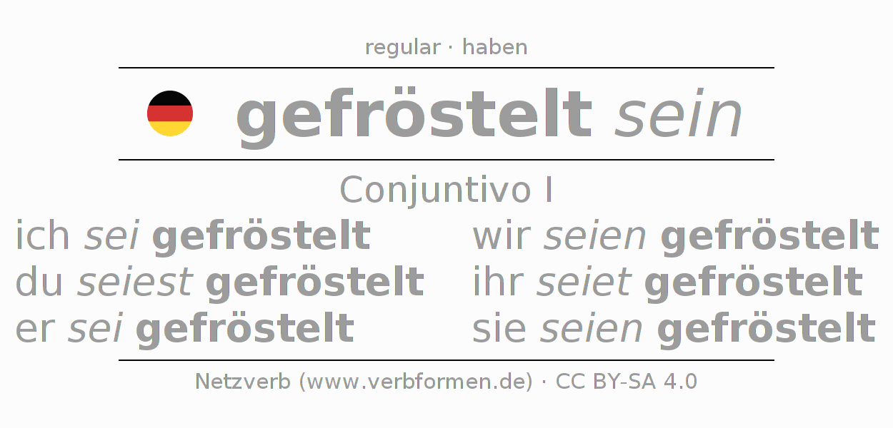 A conjugação do verbo frösteln no Estado passivo Conjuntivo Presente Conjuntivo é: ich sei gefröstelt, du seiest gefröstelt, er sei gefröstelt, wir seien gefröstelt, ihr seiet gefröstelt, sie seien gefröstelt.A formação dessas formas segue determinadas regras gramaticais. Os requisitos para a conjugação do verbo como forma verbal simples no frösteln do Conjuntivo I. Comentários ☆