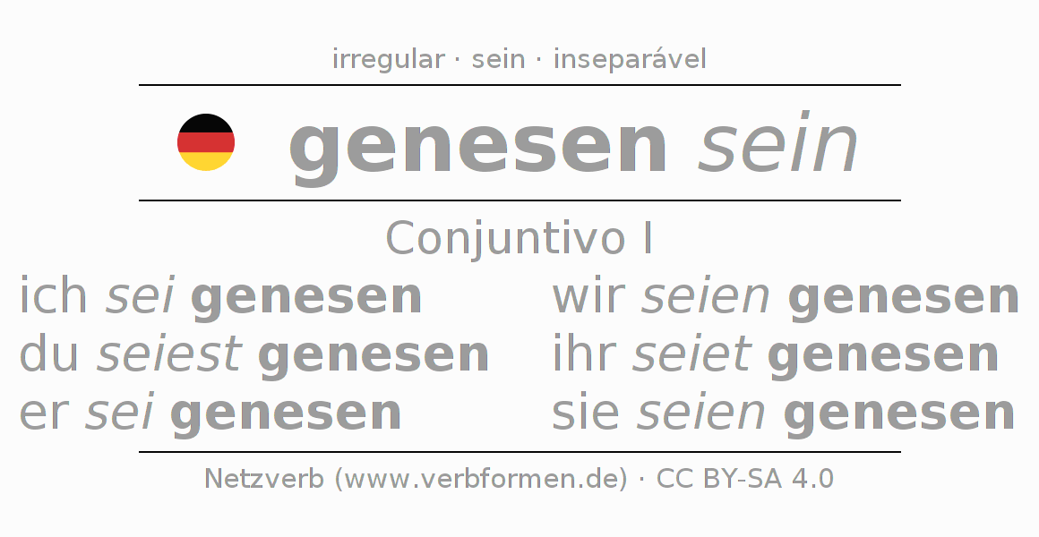 A conjugação do verbo genesen no Estado passivo Conjuntivo Presente Conjuntivo é: ich sei genesen, du seiest genesen, er sei genesen, wir seien genesen, ihr seiet genesen, sie seien genesen.A formação dessas formas segue determinadas regras gramaticais. Os requisitos para a conjugação do verbo como forma verbal simples no genesen do Conjuntivo I. Comentários ☆