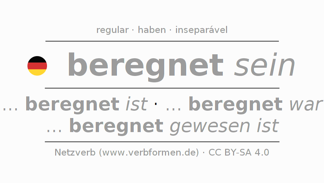 A conjugação do verbo beregnen no Estado passivo Conjuntivo Presente Conjuntivo é: ... ich beregnet sei, ... du beregnet seiest, ... er beregnet sei, ... wir beregnet seien, ... ihr beregnet seiet, ... sie beregnet seien.A formação dessas formas segue determinadas regras gramaticais. Os requisitos para a conjugação do verbo como forma verbal simples no beregnen do Conjuntivo I. Comentários ☆