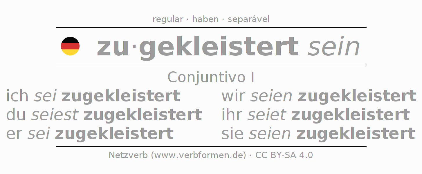 A conjugação do verbo zukleistern no Estado passivo Conjuntivo Presente Conjuntivo é: ich sei zugekleistert, du seiest zugekleistert, er sei zugekleistert, wir seien zugekleistert, ihr seiet zugekleistert, sie seien zugekleistert.A formação dessas formas segue determinadas regras gramaticais. Os requisitos para a conjugação do verbo como forma verbal simples no zukleistern do Conjuntivo I. Comentários ☆