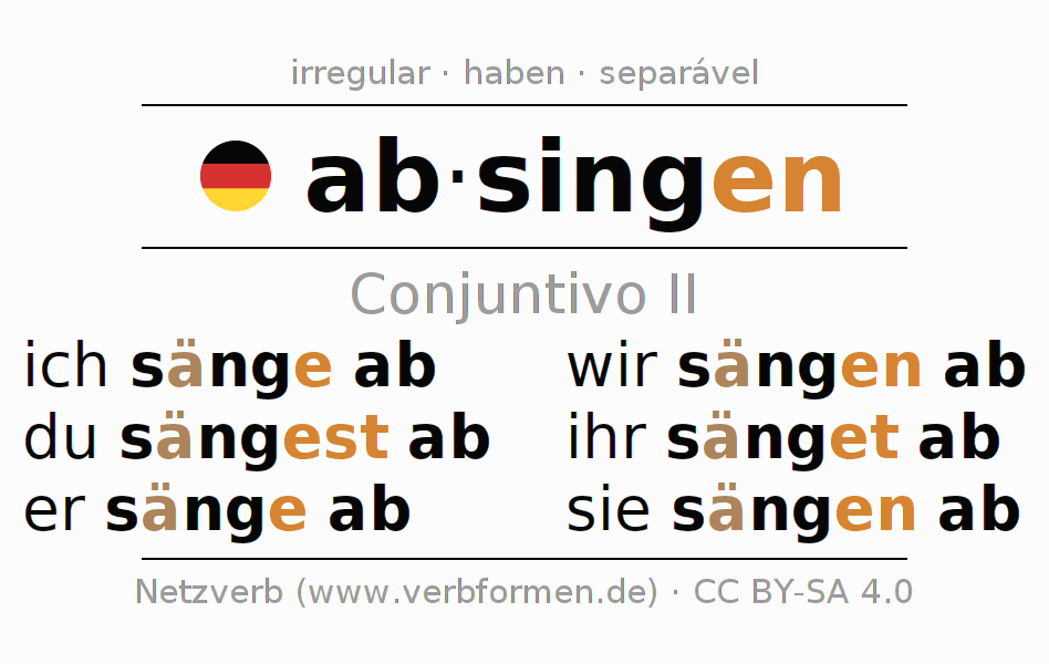 As formas de conjugação do verbo absingen (cantar improvisadamente) no conjuntivo II são: ich sänge ab, du sängest ab, er sänge ab, wir sängen ab, ihr sänget ab, sie sängen ab