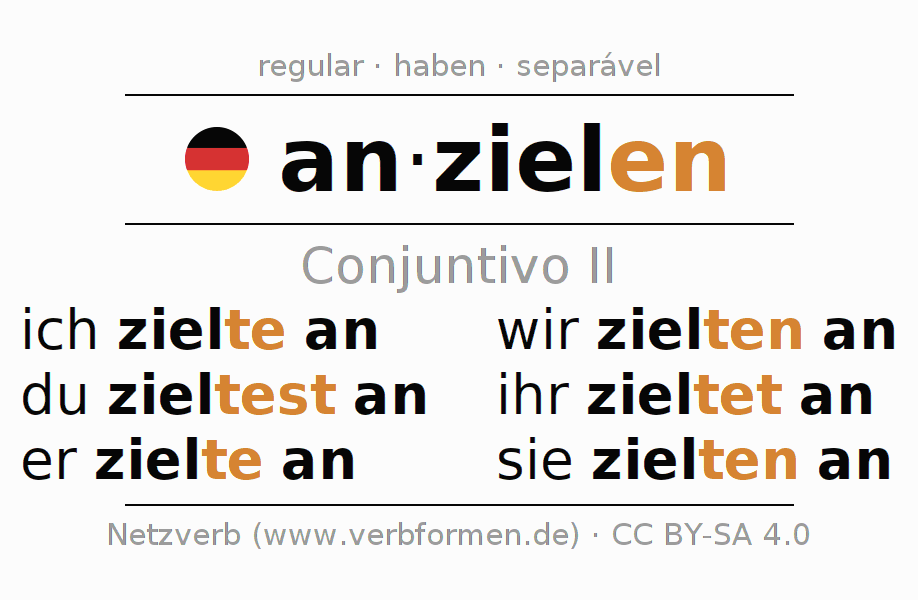 As formas de conjugação do verbo anzielen (almejar, ter como objetivo) no conjuntivo II são: ich zielte an, du zieltest an, er zielte an, wir zielten an, ihr zieltet an, sie zielten an