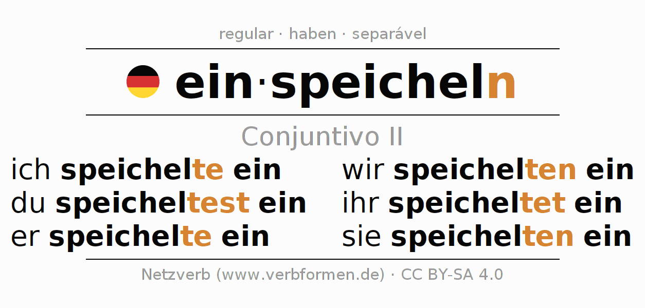 As formas de conjugação do verbo einspeicheln (cobrir com saliva, misturar) no conjuntivo II são: ich speichelte ein, du speicheltest ein, er speichelte ein, wir speichelten ein, ihr speicheltet ein, sie speichelten ein
