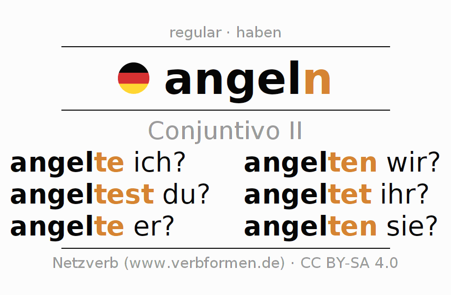 A conjugação do verbo angeln no Ativo Conjuntivo Pretérito Conjuntivo é: angelte ich?, angeltest du?, angelte er?, angelten wir?, angeltet ihr?, angelten sie?.A formação dessas formas segue determinadas regras gramaticais. Os requisitos para a conjugação do verbo como forma verbal simples no angeln do Conjuntivo II. Comentários ☆