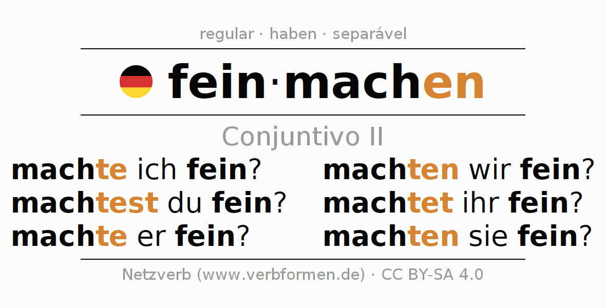 A conjugação do verbo feinmachen no Ativo Conjuntivo Pretérito Conjuntivo é: machte ich fein?, machtest du fein?, machte er fein?, machten wir fein?, machtet ihr fein?, machten sie fein?.A formação dessas formas segue determinadas regras gramaticais. Os requisitos para a conjugação do verbo como forma verbal simples no feinmachen do Conjuntivo II. Comentários ☆