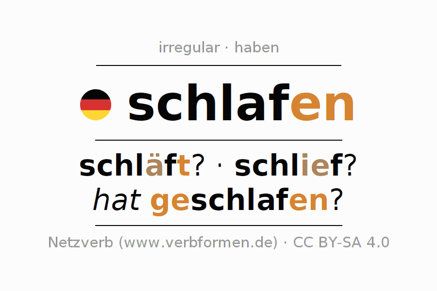 A conjugação do verbo schlafen no Ativo Conjuntivo Pretérito Conjuntivo é: schliefe ich?, schliefest du?, schliefe er?, schliefen wir?, schliefet ihr?, schliefen sie?.A formação dessas formas segue determinadas regras gramaticais. Os requisitos para a conjugação do verbo como forma verbal simples no schlafen do Conjuntivo II. Comentários ☆