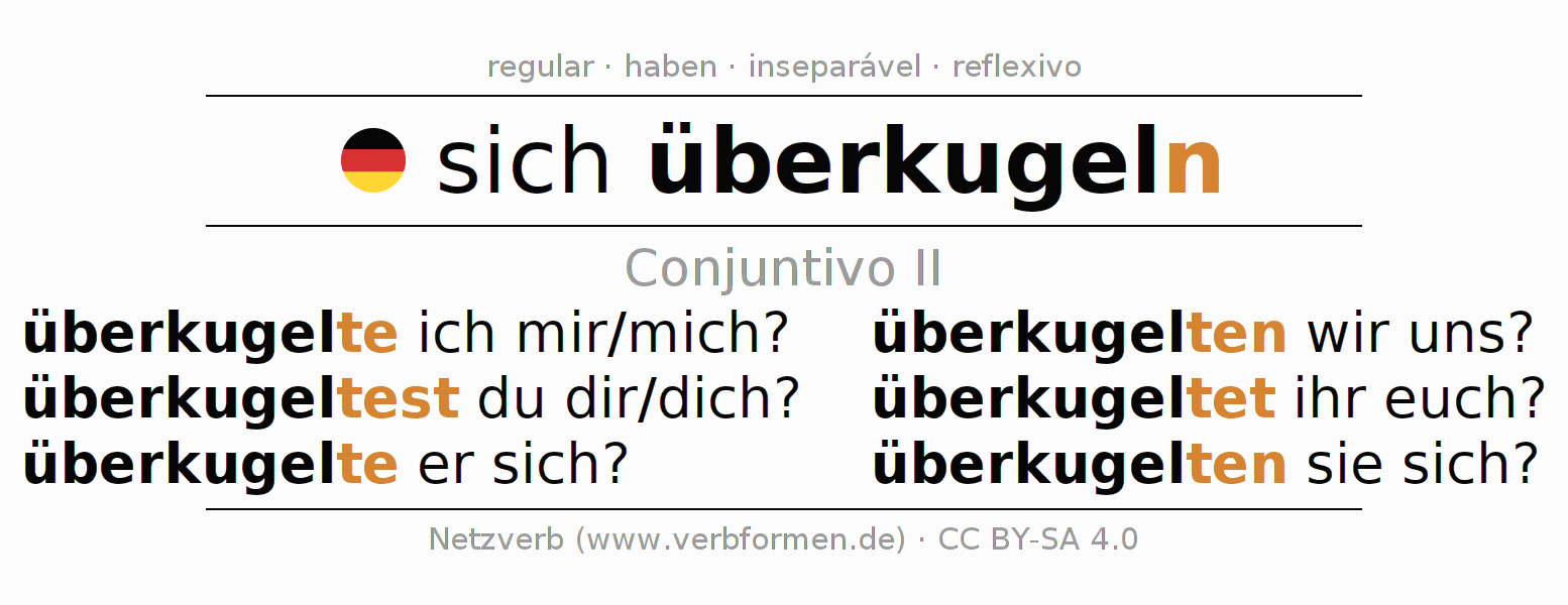 A conjugação do verbo sich überkugeln no Ativo Conjuntivo Pretérito Conjuntivo é: überkugelte ich mir/mich?, überkugeltest du dir/dich?, überkugelte er sich?, überkugelten wir uns?, überkugeltet ihr euch?, überkugelten sie sich?.A formação dessas formas segue determinadas regras gramaticais. Os requisitos para a conjugação do verbo como forma verbal simples no überkugeln do Conjuntivo II. Comentários ☆