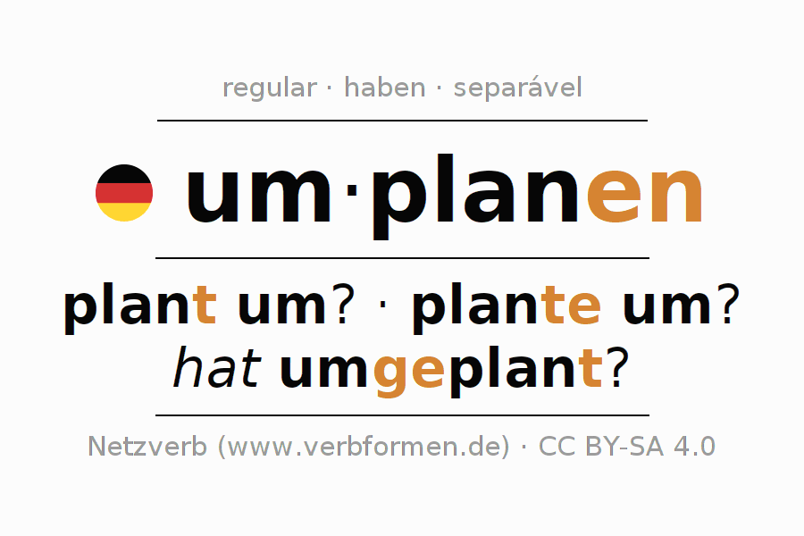 A conjugação do verbo umplanen no Ativo Conjuntivo Pretérito Conjuntivo é: plante ich um?, plantest du um?, plante er um?, planten wir um?, plantet ihr um?, planten sie um?.A formação dessas formas segue determinadas regras gramaticais. Os requisitos para a conjugação do verbo como forma verbal simples no umplanen do Conjuntivo II. Comentários ☆