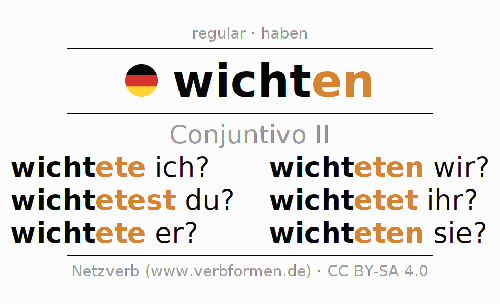 A conjugação do verbo wichten no Ativo Conjuntivo Pretérito Conjuntivo é: wichtete ich?, wichtetest du?, wichtete er?, wichteten wir?, wichtetet ihr?, wichteten sie?.A formação dessas formas segue determinadas regras gramaticais. Os requisitos para a conjugação do verbo como forma verbal simples no wichten do Conjuntivo II. Comentários ☆