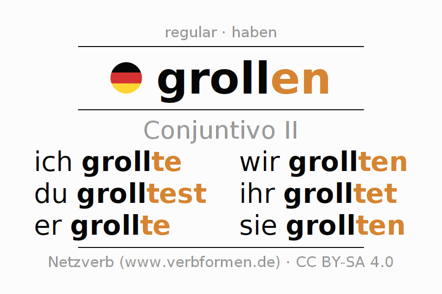 As formas de conjugação do verbo grollen (estrondar, guardar rancor) no conjuntivo II são: ich grollte, du grolltest, er grollte, wir grollten, ihr grolltet, sie grollten