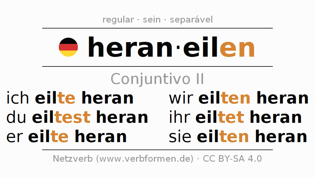 As formas de conjugação do verbo heraneilen (apressar-se, aproximar-se rapidamente) no conjuntivo II são: ich eilte heran, du eiltest heran, er eilte heran, wir eilten heran, ihr eiltet heran, sie eilten heran
