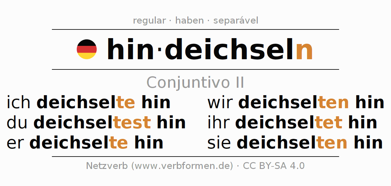 As formas de conjugação do verbo hindeichseln (dobrar, manipular) no conjuntivo II são: ich deichselte hin, du deichseltest hin, er deichselte hin, wir deichselten hin, ihr deichseltet hin, sie deichselten hin