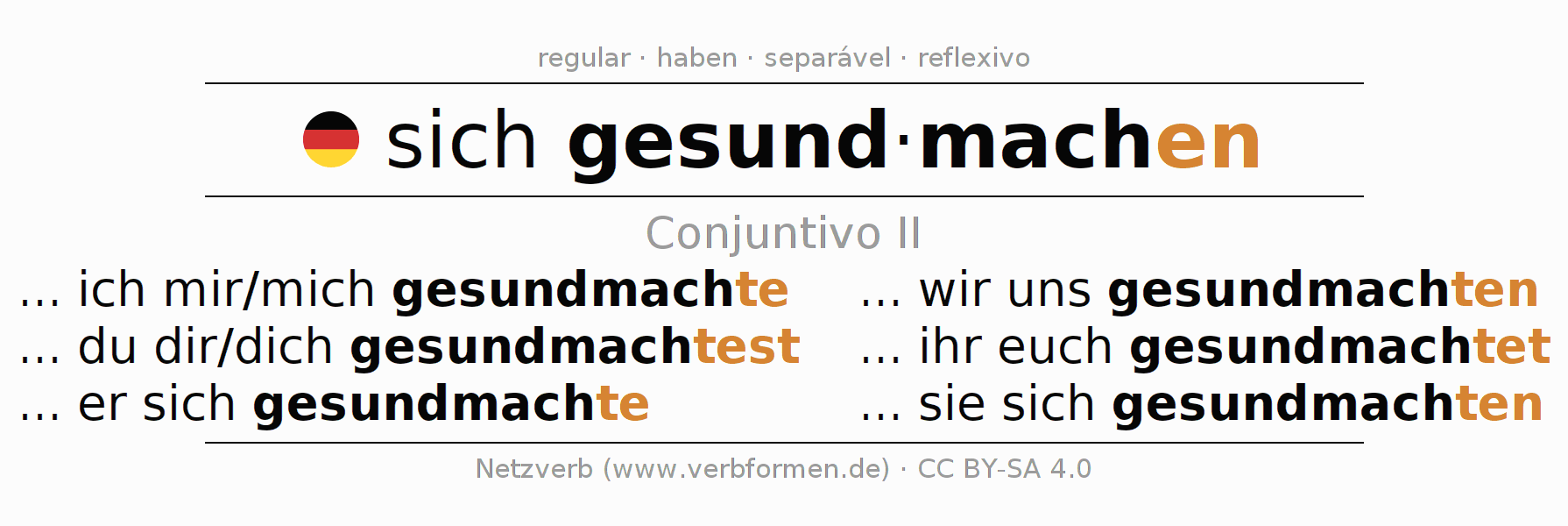 A conjugação do verbo sich gesundmachen no Ativo Conjuntivo Pretérito Conjuntivo é: ... ich mir/mich gesundmachte, ... du dir/dich gesundmachtest, ... er sich gesundmachte, ... wir uns gesundmachten, ... ihr euch gesundmachtet, ... sie sich gesundmachten.A formação dessas formas segue determinadas regras gramaticais. Os requisitos para a conjugação do verbo como forma verbal simples no gesundmachen do Conjuntivo II. Comentários ☆