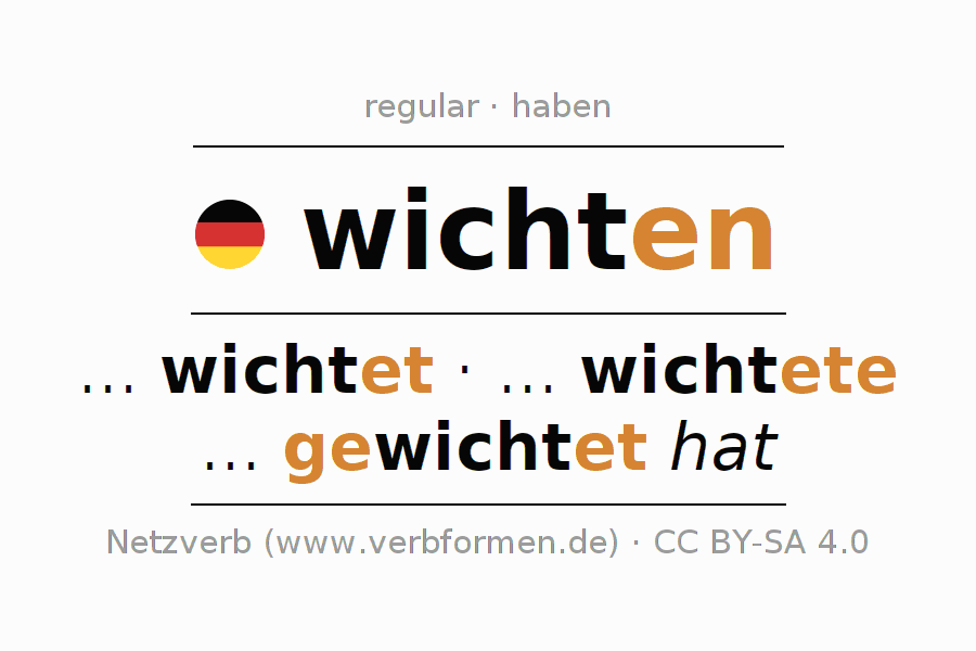 A conjugação do verbo wichten no Ativo Conjuntivo Pretérito Conjuntivo é: ... ich wichtete, ... du wichtetest, ... er wichtete, ... wir wichteten, ... ihr wichtetet, ... sie wichteten.A formação dessas formas segue determinadas regras gramaticais. Os requisitos para a conjugação do verbo como forma verbal simples no wichten do Conjuntivo II. Comentários ☆