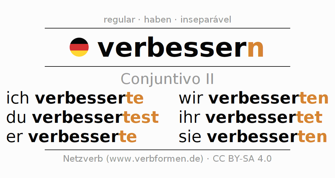 As formas de conjugação do verbo verbessern (melhorar, corrigir) no conjuntivo II são: ich verbesserte, du verbessertest, er verbesserte, wir verbesserten, ihr verbessertet, sie verbesserten