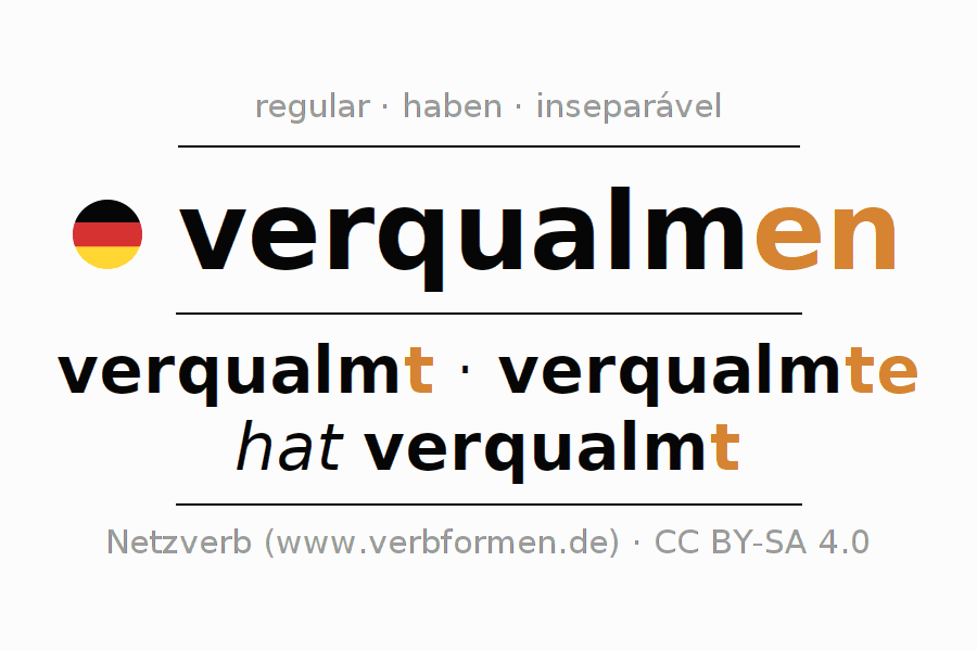 As formas de conjugação do verbo verqualmen (encher de fumaça) no conjuntivo II são: ich verqualmte, du verqualmtest, er verqualmte, wir verqualmten, ihr verqualmtet, sie verqualmten