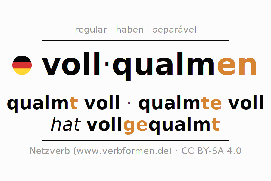 As formas de conjugação do verbo vollqualmen (encher de fumaça) no conjuntivo II são: ich qualmte voll, du qualmtest voll, er qualmte voll, wir qualmten voll, ihr qualmtet voll, sie qualmten voll