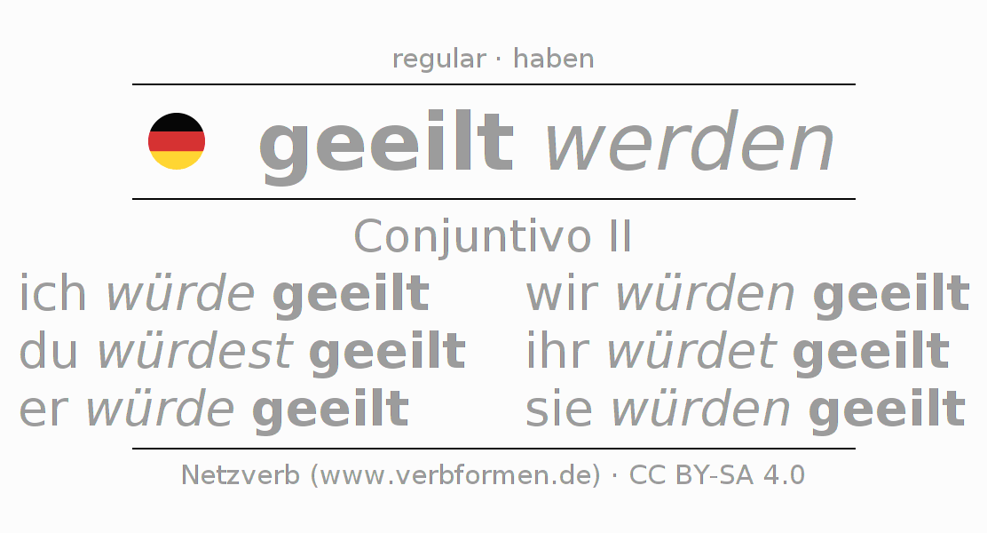 A conjugação do verbo eilen no Voz Passiva Conjuntivo Pretérito Conjuntivo é: ich würde geeilt, du würdest geeilt, er würde geeilt, wir würden geeilt, ihr würdet geeilt, sie würden geeilt.A formação dessas formas segue determinadas regras gramaticais. Os requisitos para a conjugação do verbo como forma verbal simples no eilen do Conjuntivo II. Comentários ☆