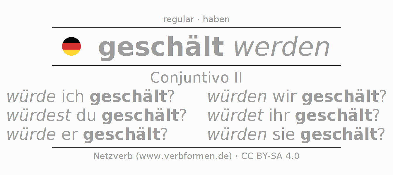 A conjugação do verbo schälen no Voz Passiva Conjuntivo Pretérito Conjuntivo é: würde ich geschält?, würdest du geschält?, würde er geschält?, würden wir geschält?, würdet ihr geschält?, würden sie geschält?.A formação dessas formas segue determinadas regras gramaticais. Os requisitos para a conjugação do verbo como forma verbal simples no schälen do Conjuntivo II. Comentários ☆