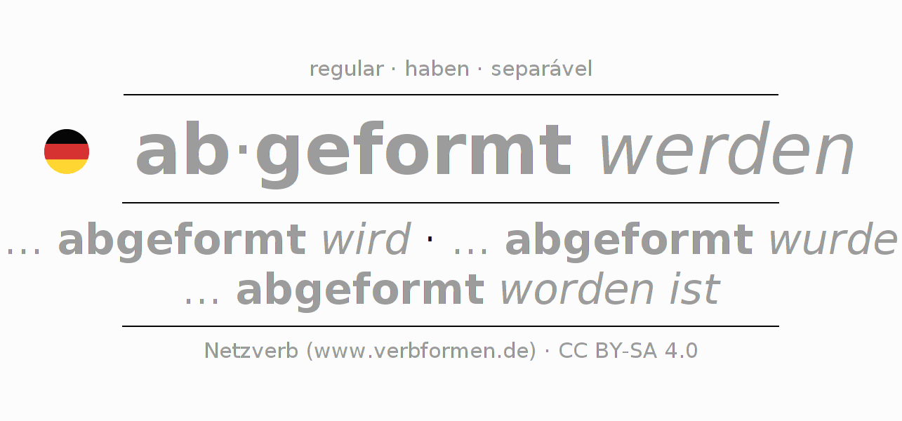A conjugação do verbo abformen no Voz Passiva Conjuntivo Pretérito Conjuntivo é: ... ich abgeformt würde, ... du abgeformt würdest, ... er abgeformt würde, ... wir abgeformt würden, ... ihr abgeformt würdet, ... sie abgeformt würden.A formação dessas formas segue determinadas regras gramaticais. Os requisitos para a conjugação do verbo como forma verbal simples no abformen do Conjuntivo II. Comentários ☆