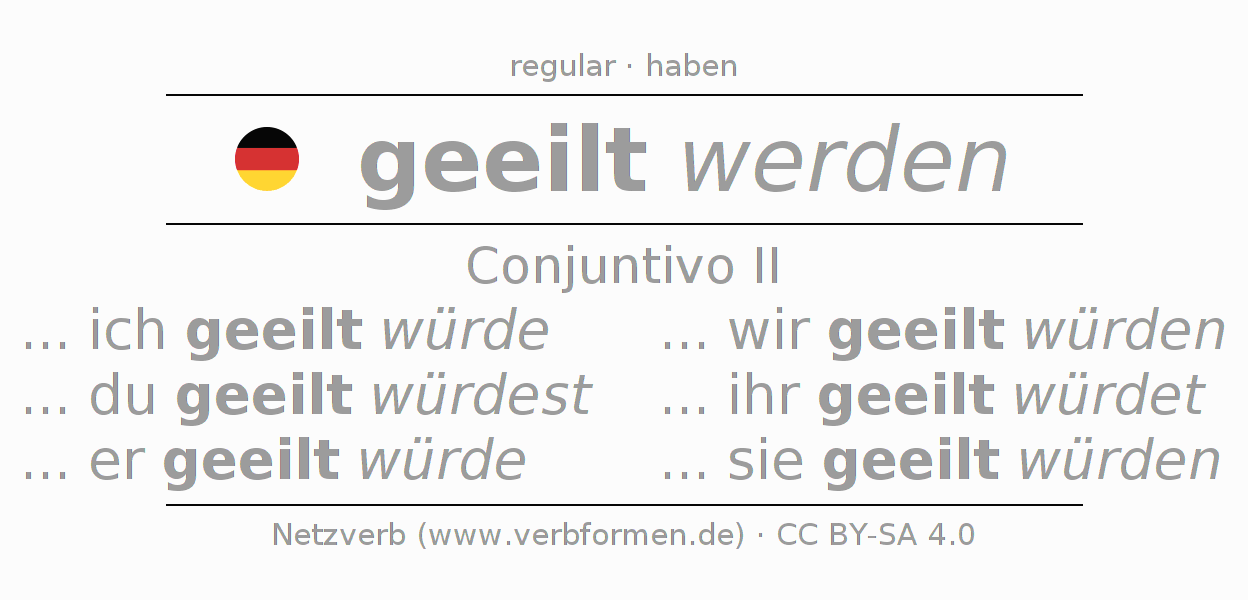A conjugação do verbo eilen no Voz Passiva Conjuntivo Pretérito Conjuntivo é: ... ich geeilt würde, ... du geeilt würdest, ... er geeilt würde, ... wir geeilt würden, ... ihr geeilt würdet, ... sie geeilt würden.A formação dessas formas segue determinadas regras gramaticais. Os requisitos para a conjugação do verbo como forma verbal simples no eilen do Conjuntivo II. Comentários ☆