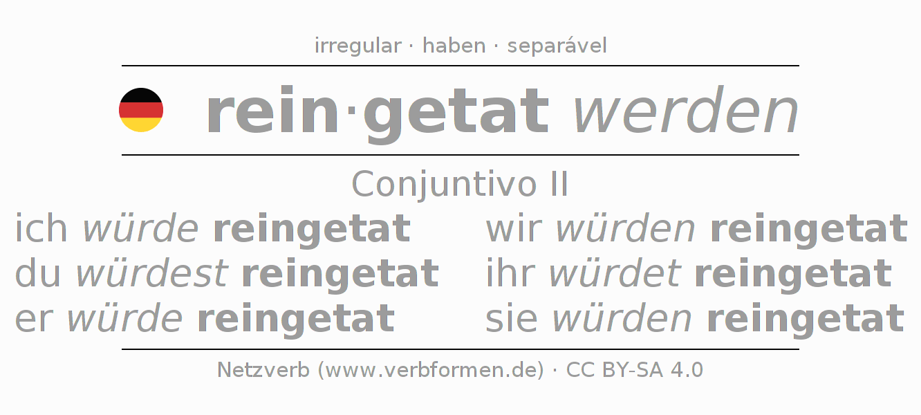 A conjugação do verbo reintun no Voz Passiva Conjuntivo Pretérito Conjuntivo é: ich würde reingetat, du würdest reingetat, er würde reingetat, wir würden reingetat, ihr würdet reingetat, sie würden reingetat.A formação dessas formas segue determinadas regras gramaticais. Os requisitos para a conjugação do verbo como forma verbal simples no reintun do Conjuntivo II. Comentários ☆